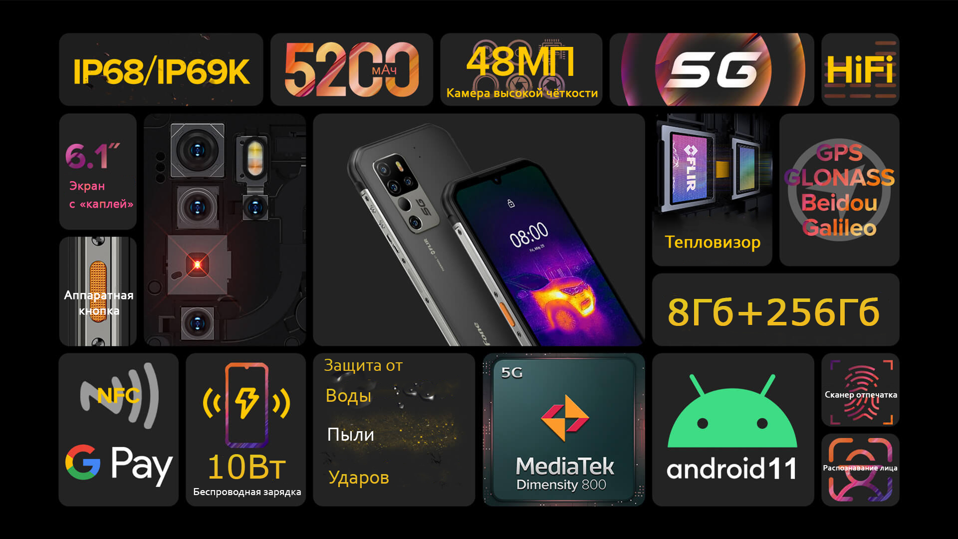 3. Ulefone Armor 11T 5G обладает защитой от брызг, воды и пыли. Он был протестирован в лабораторных условиях на соответствие стандарту IP68 (до 30 минут на глубине не более 1.5 метра) по классификации IEC 60529. Зарядное устройство и аксессуары не обладают защитой от воды. Защита от брызг, воды и пыли может деградировать со временем в результате обычной эксплуатации. Не пытайтесь заряжать Armor 11 5G если он мокрый. Повреждения, вызванные жидкостями, не являются гарантийными.